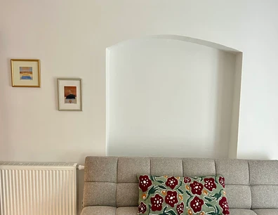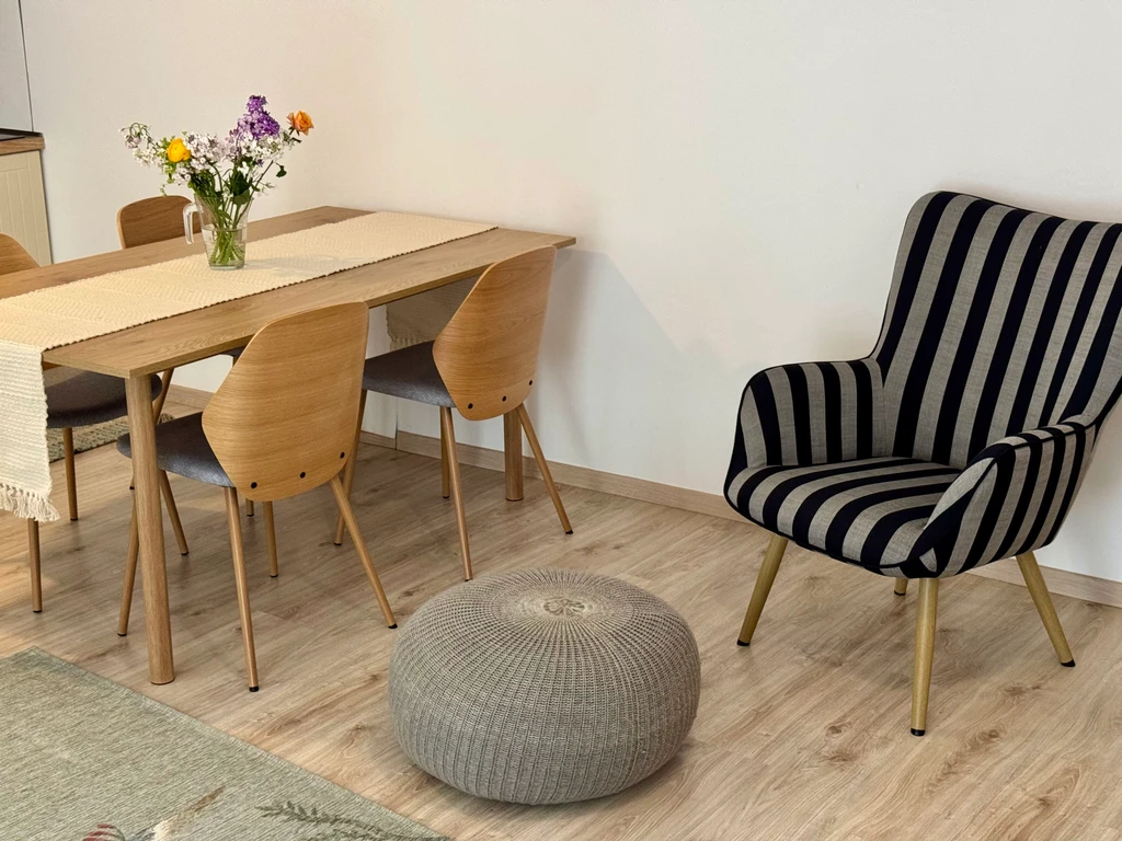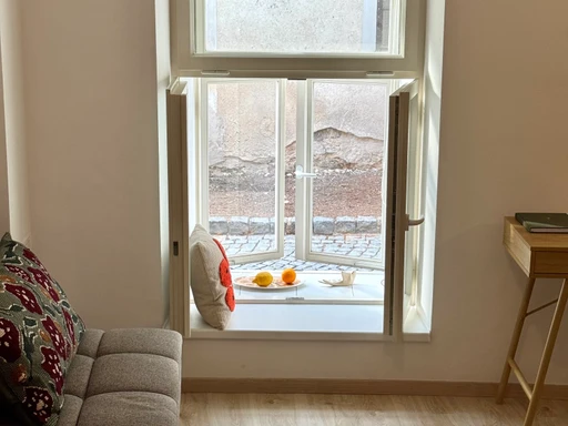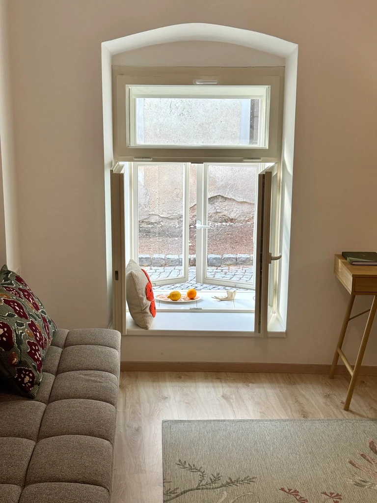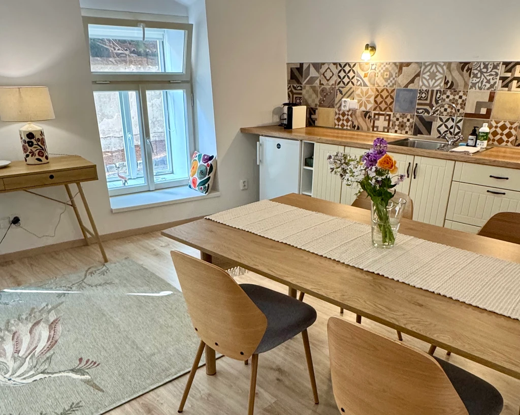 Apartmán Na bidýlku v srdci historického Tábora spojuje kouzlo středověkých uliček s moderním pohodlím. Ubytuje až 4 osoby, nabízí klidnou ložnici do vnitrobloku, prostorný obývací pokoj s jídelním stolem a rozkládacím gaučem i plně vybavenou kuchyň s kávovarem pro příjemná rána.