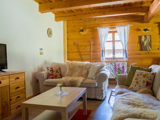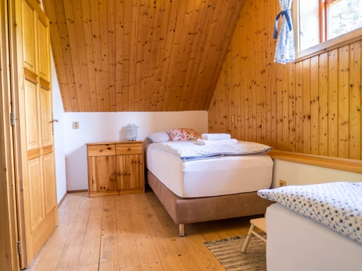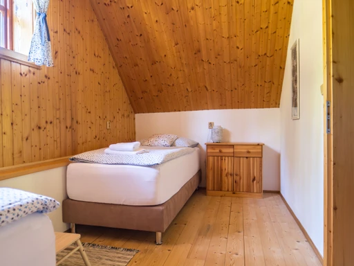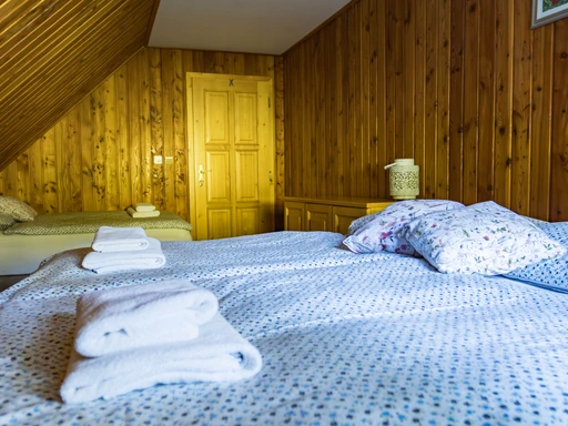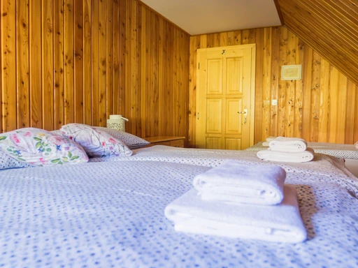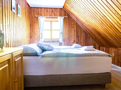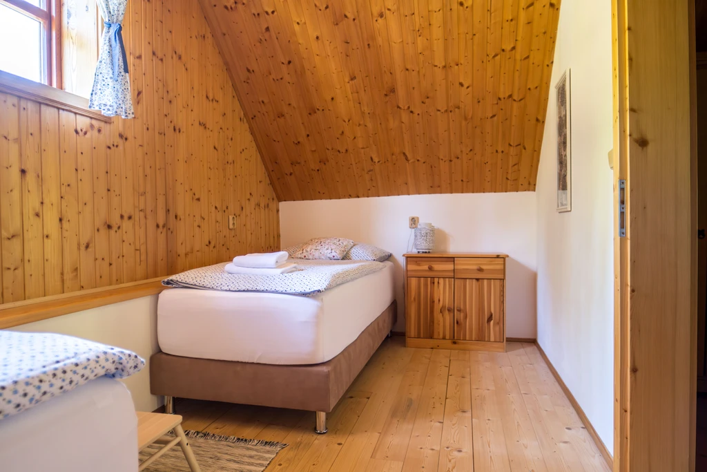 Chalupa Jednička nabízí ubytování až pro 8 osob ve třech ložnicích. V přízemí je společenská místnost s krbem, plně vybavená kuchyň, sauna a druhá koupelna. Nechybí kávovar, čaje, myčka a dětská postýlka.