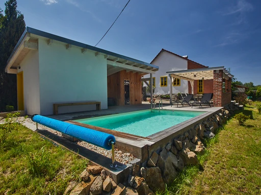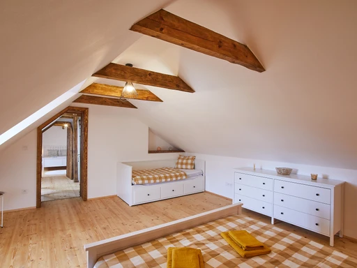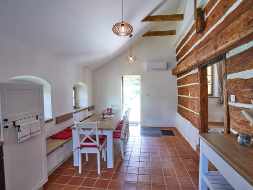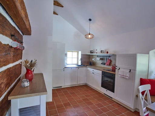 Zrekonstruovaná chalupa poskytne ubytování ve třech ložnicích po čtyřech lůžkách celkem 12 osobám, plně vybavenou kuchyň, obývací pokoj, dvě koupelny se společným WC, vinný sklep a zahradu.