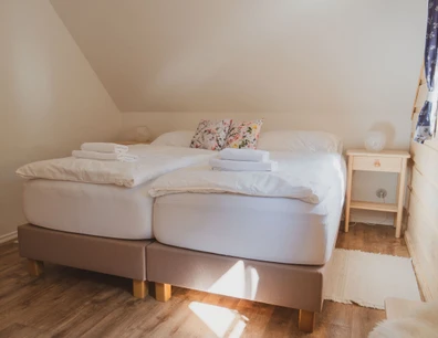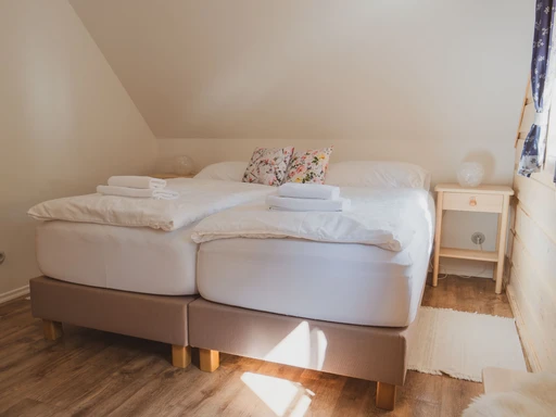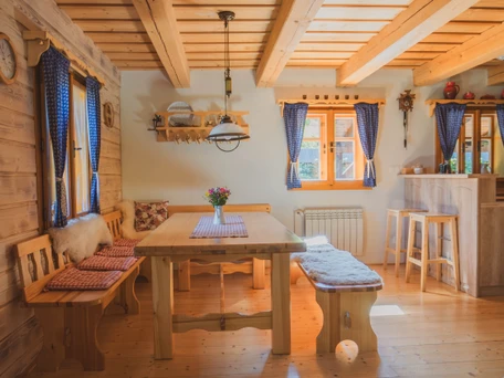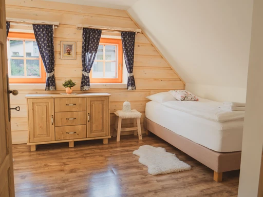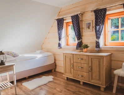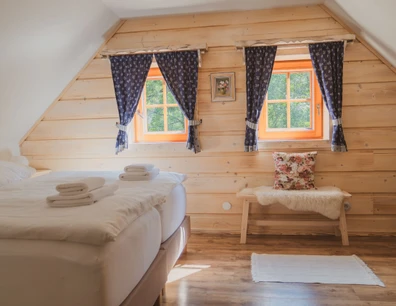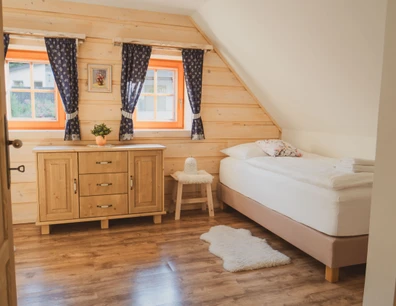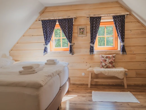 Pomněnka je nejmenší chalupa areálu, ideální pro rodiny i páry. Nabízí dvě ložnice, saunu, plně vybavenou kuchyň a obývací pokoj s krbovými kamny. Nechybí dětské vybavení, čaje ani kávovar Dolce Gusto.