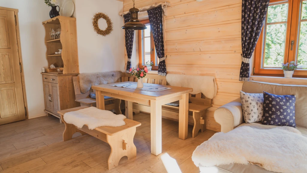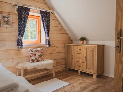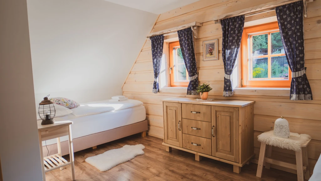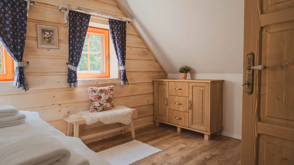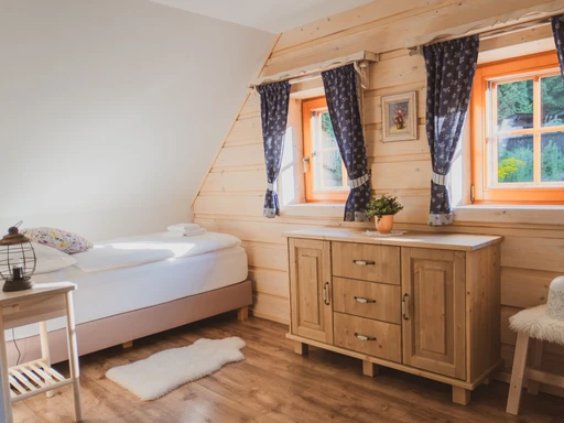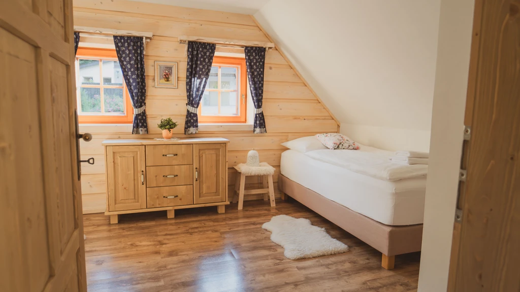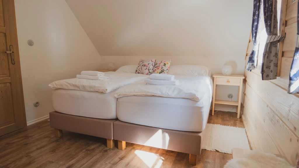 Pomněnka je nejmenší chalupa areálu, ideální pro rodiny i páry. Nabízí dvě ložnice, saunu, plně vybavenou kuchyň a obývací pokoj s krbovými kamny. Nechybí dětské vybavení, čaje ani kávovar Dolce Gusto.