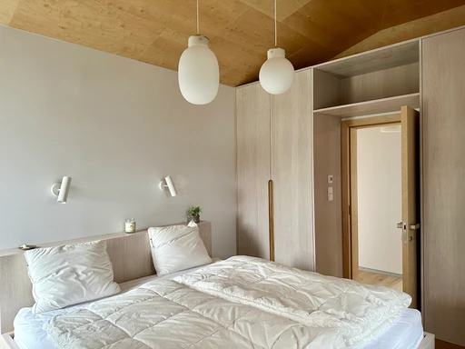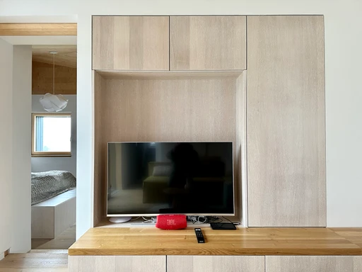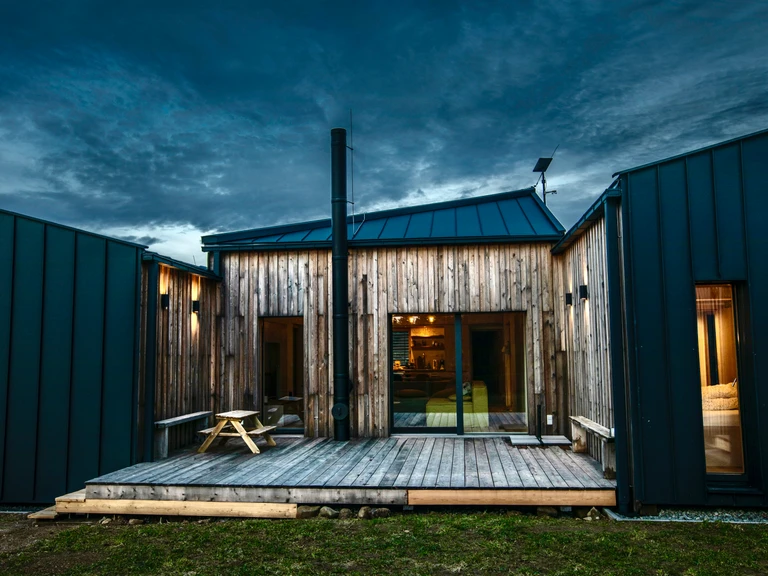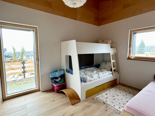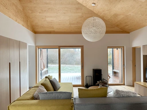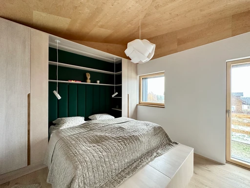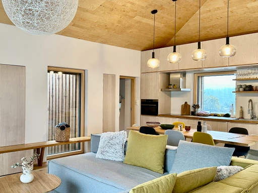 Stylovou chatu od studia Momentura zdobí čisté linky, prosvětlený interiér a jedinečný design. V prostřední části má obývací místnost s plně vybavenou kuchyní a jídelním stolem. Díky třem samostatným ložnicím tu máte dost soukromí a pohodlně se v nich vyspí až 5 dospělých a tři děti. K dispozici jim budou dvě koupelny se sprchou a vanou. Pračka se sušičkou jen potvrdí fakt, že tady vám s rodinou nebude nic chybět.