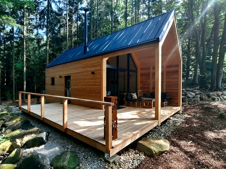 Nedaleko řeky Sázavy, obklopeny lesem a tichým šumem korun stromů, stojí dva domky zasazené do přírody s citem a úctou k místu. Větší z nich je ideální pro rodinu – nabízí útulný interiér, krb a terasu s výhledem do zeleně. Menší domek je jako stvořený pro páry, které ocení vanu pro dva, ložnici s krbem a klidnou atmosféru s výhledem do lesa. Oba domky jsou plně vybaveny – nechybí podlahové topení, kuchyň ani pohodlné postele. V okolí můžete objevovat kouzlo Sázavy, ochutnat vodu ze studánky nebo využít zázemí nedalekého hotelu Kouty, kde vás čeká nejen skvělé jídlo, ale i wellness či sportovní aktivity. Stačí si zabalit to nejnutnější – zbytek už na vás čeká na místě.