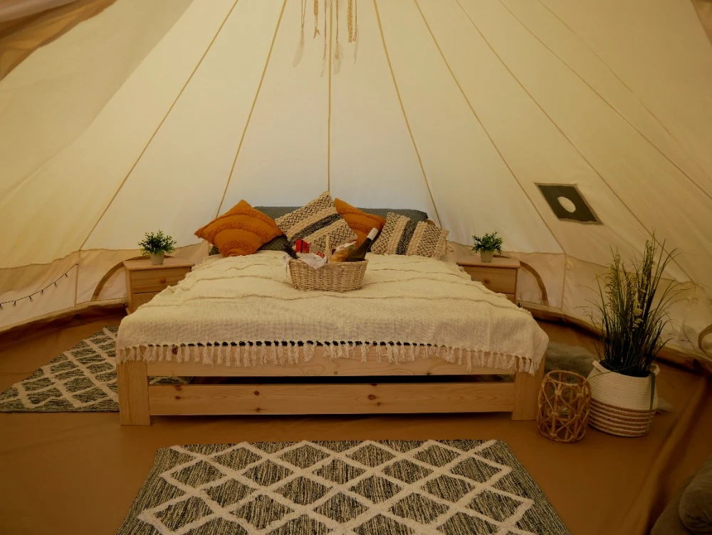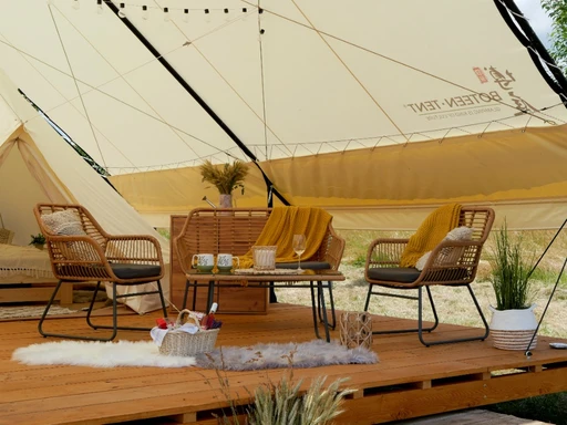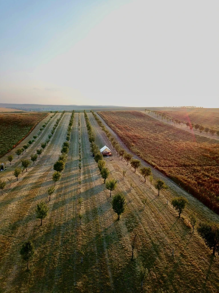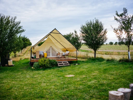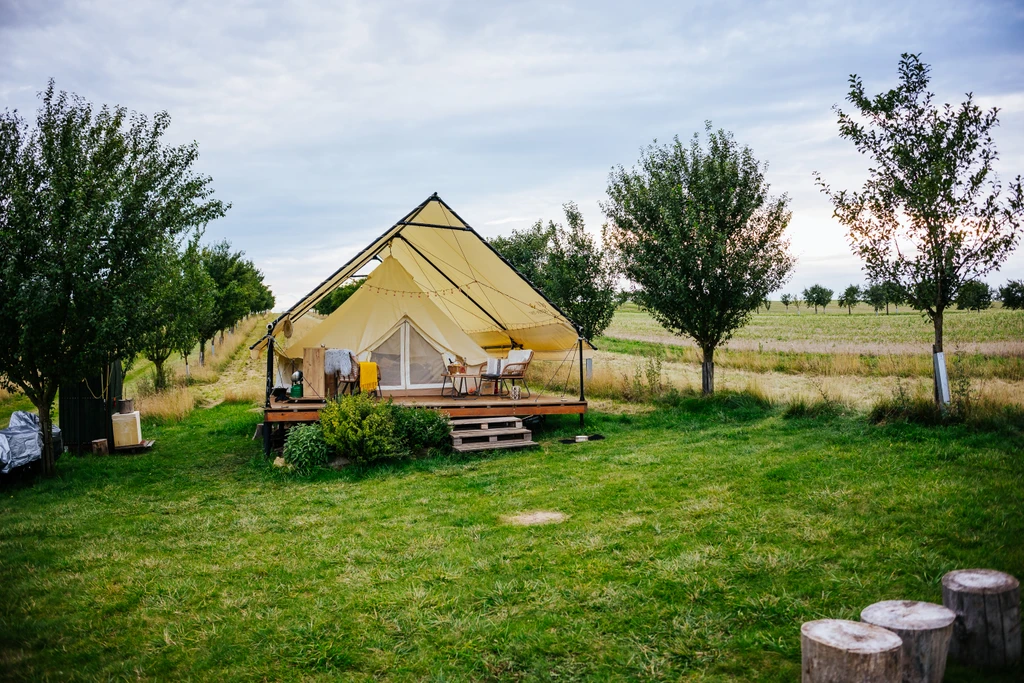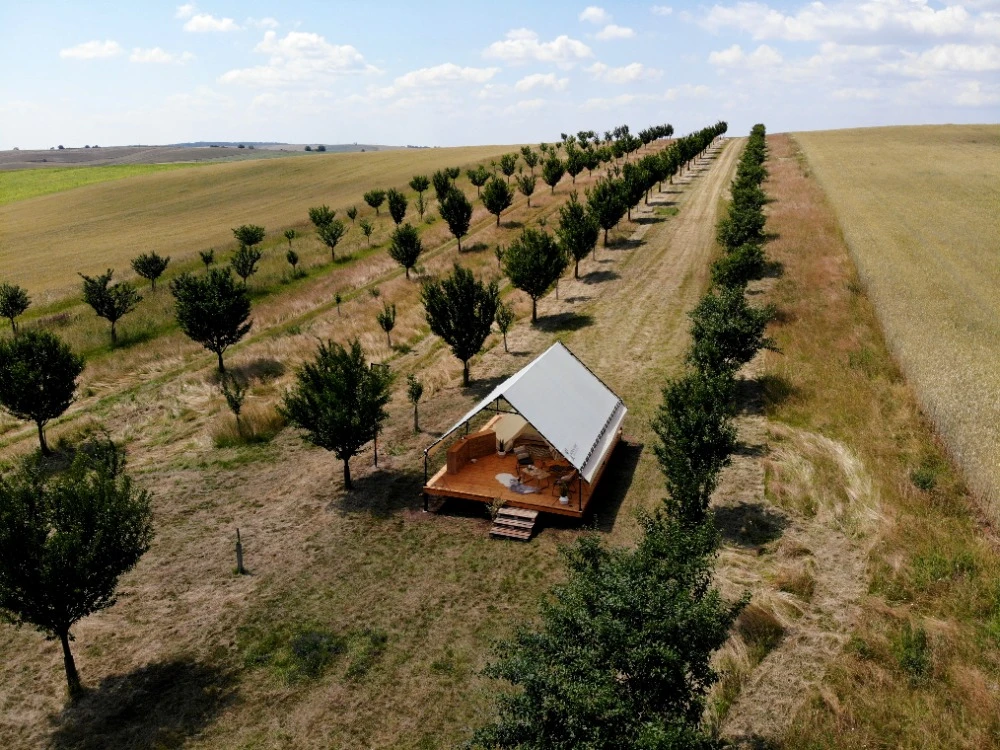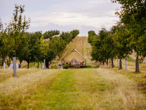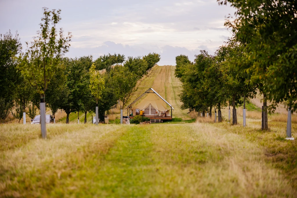Představte si probuzení uprostřed trnkového sadu, kde je jediným sousedem klidná jihomoravská příroda. Náš glamp v oblasti Moravského Toskánska je záměrně odloučen od světa a jeho přesnou polohu budete znát jen vy. Krajina Moravského Toskánska je pro svůj unikátní zvlněný reliéf vyhledávaným cílem fotografů z celého světa a vy ji můžete pozorovat přímo z postele. Sad se během roku proměňuje – od jarních květů až po měsíce, kdy větve těžknou plody, které můžete sami ochutnat. Ačkoliv budete v naprostém soukromí, na dohled máte Pálavu i hranice s Rakouskem a Slovenskem. K dokonalému odpočinku patří i sklenka od našich dvou partnerských vinařství a společnost vašich čtyřnohých mazlíčků.