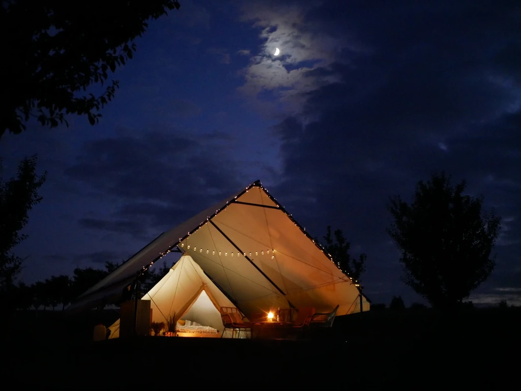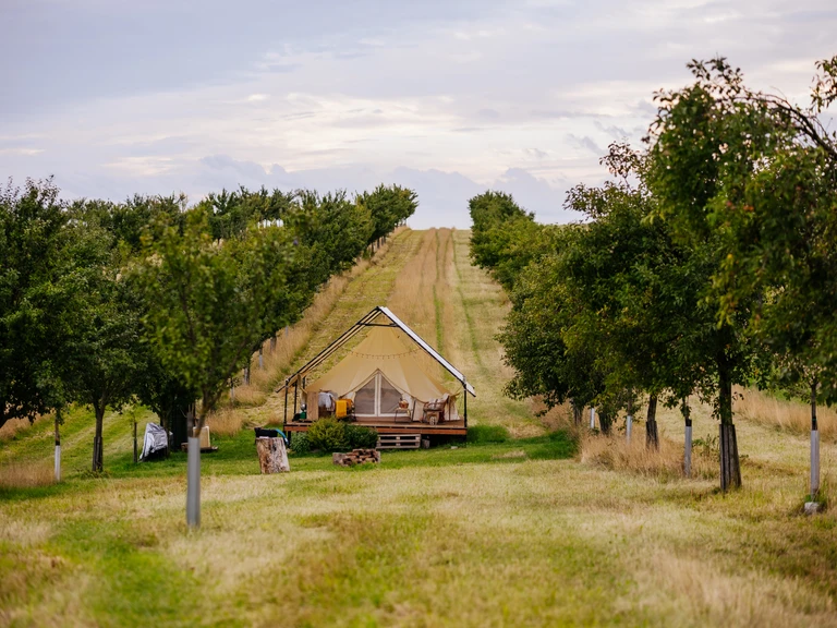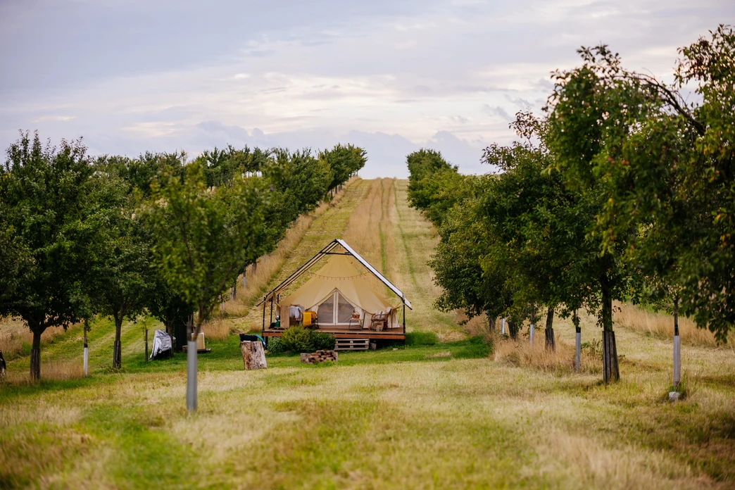 Představte si probuzení uprostřed trnkového sadu, kde je jediným sousedem klidná jihomoravská příroda. Náš glamp v oblasti Moravského Toskánska je záměrně odloučen od světa a jeho přesnou polohu budete znát jen vy. Krajina Moravského Toskánska je pro svůj unikátní zvlněný reliéf vyhledávaným cílem fotografů z celého světa a vy ji můžete pozorovat přímo z postele. Sad se během roku proměňuje – od jarních květů až po měsíce, kdy větve těžknou plody, které můžete sami ochutnat. Ačkoliv budete v naprostém soukromí, na dohled máte Pálavu i hranice s Rakouskem a Slovenskem. K dokonalému odpočinku patří i sklenka od našich dvou partnerských vinařství a společnost vašich čtyřnohých mazlíčků.