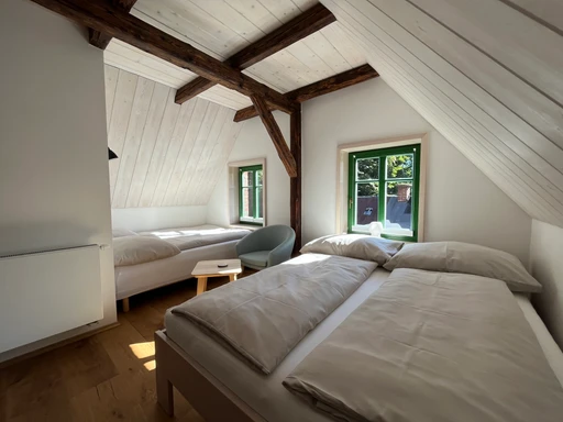 Ložnice s komínem a dřevěnými trámy