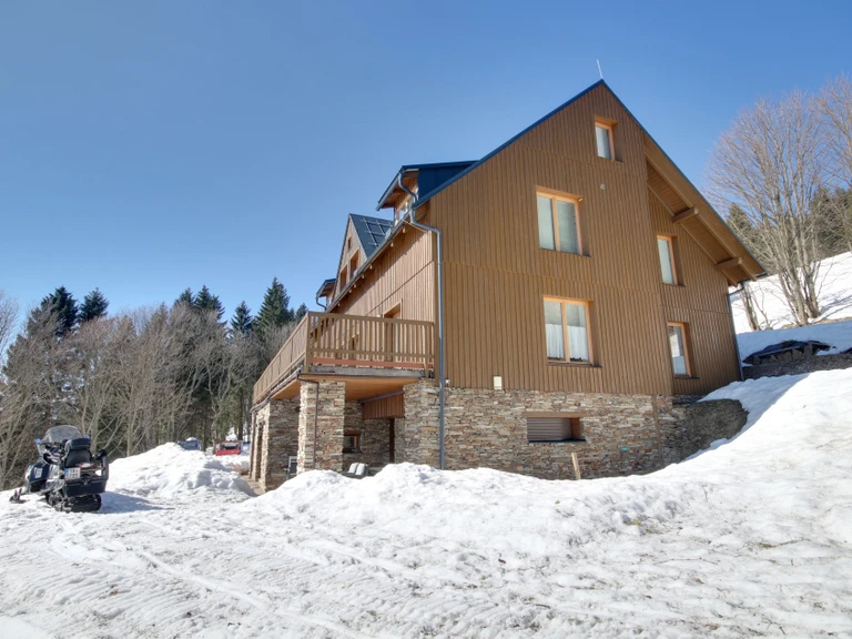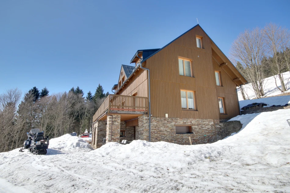 Luxury Wellness Apartment stojí přímo u lanovky Horní domky na hranici dvou oblíbených areálů – Rokytnice nad Jizerou a Harrachova. Díky exkluzivní poloze si můžete vybírat, kde zrovna lyžovat, a mezi středisky se pohodlně přesunete sněžným skútrem. Apartmán vznikl ve spolupráci přední české designérky a expertů na alpskou architekturu, takže tu nechybí styl ani promyšlený komfort. V přízemí najdete kuchyni s vestavěnou vinotékou, která ukrývá pečlivě vybraná vína, a útulný obývák s krbem. Dvě ložnice v patře mají přímý vstup na terasu s výhledem do horské krajiny. Luxusní útočiště pro ty, kdo chtějí na horách to nejlepší.