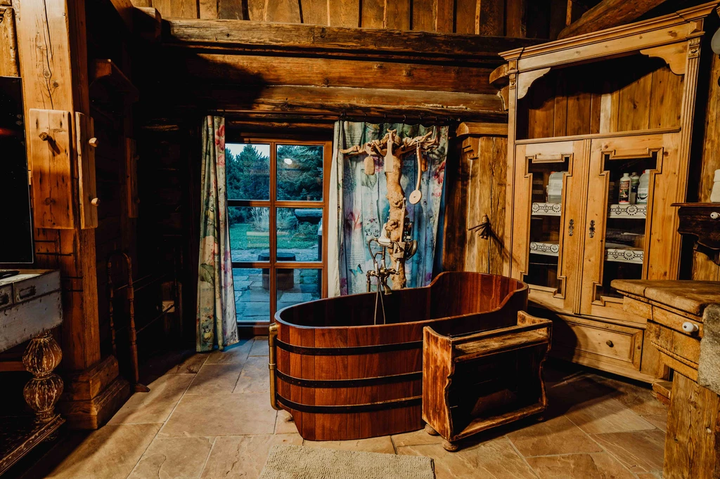 Jen málokdy narazíte na místo, které vás doslova přenese do jiného světa – tento srub to ale dokáže. Masivní dřevo, otevřený obytný prostor s krbovými kamny a propojení s kuchyní i jídelnou vytvářejí atmosféru, která je zároveň luxusní i útulná. Nechybí kulečník, kávovar na zrnkovou kávu ani přístup na terasu se soukromou dřevěnou vířivkou. Hlavní ložnice nabízí dvě pohodlná manželská lůžka, v samostatném ateliéru na pozemku je další čtyřlůžkový pokoj se soukromou koupelnou – ideální pro větší skupinu nebo rodinu. Každý detail tu slouží k jedinému cíli: abyste si užili opravdový klid, prostor a komfort na dosah přírody.