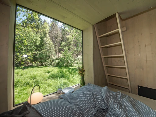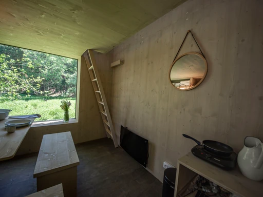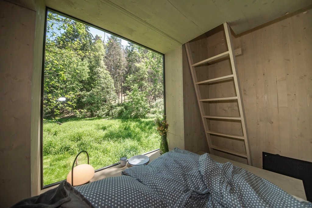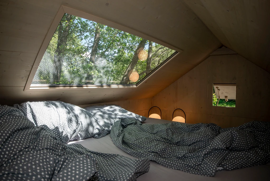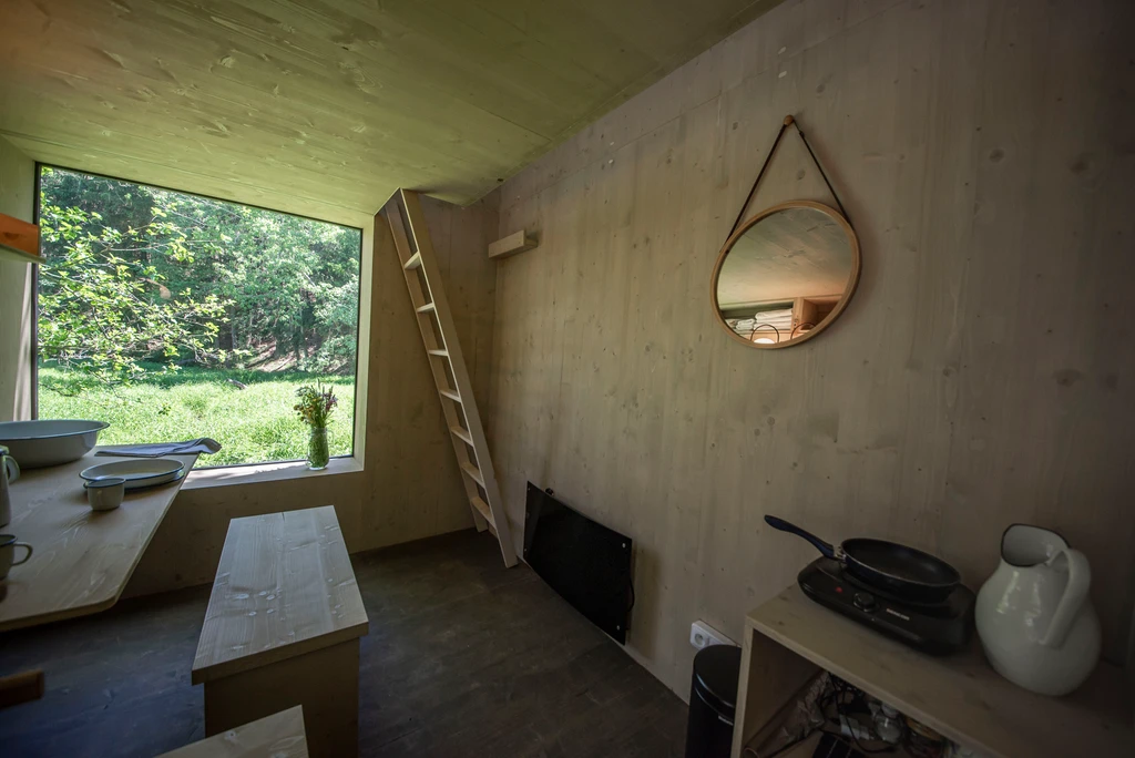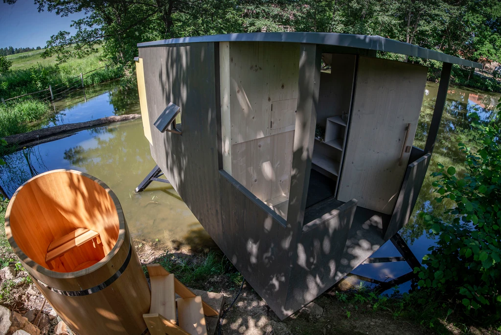 V srdci olšového háje nad zurčícím potokem se ukrývá celoročně obyvatelný posed s výhledem na krajinu i noční oblohu. Díky skládací posteli se vnitřní prostor snadno promění v místo pro tanec, stolování nebo relax. Komfort zajišťují kamínka, elektřina, stylové umyvadlo s nádrží i sezení v panoramatickém okně. Vyspí se tu až čtyři osoby, ale nejlépe si ho užijete ve dvou. Venku čeká ohniště, koupací jezírko, louka, rybník, dětské i volejbalové hřiště a kadibudka. Ideální výchozí bod pro tiché chvíle v přírodě i malé výlety po okolí.