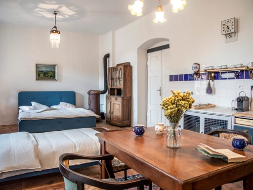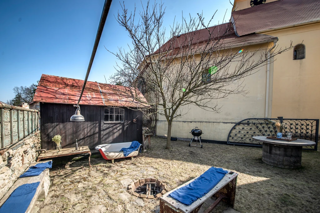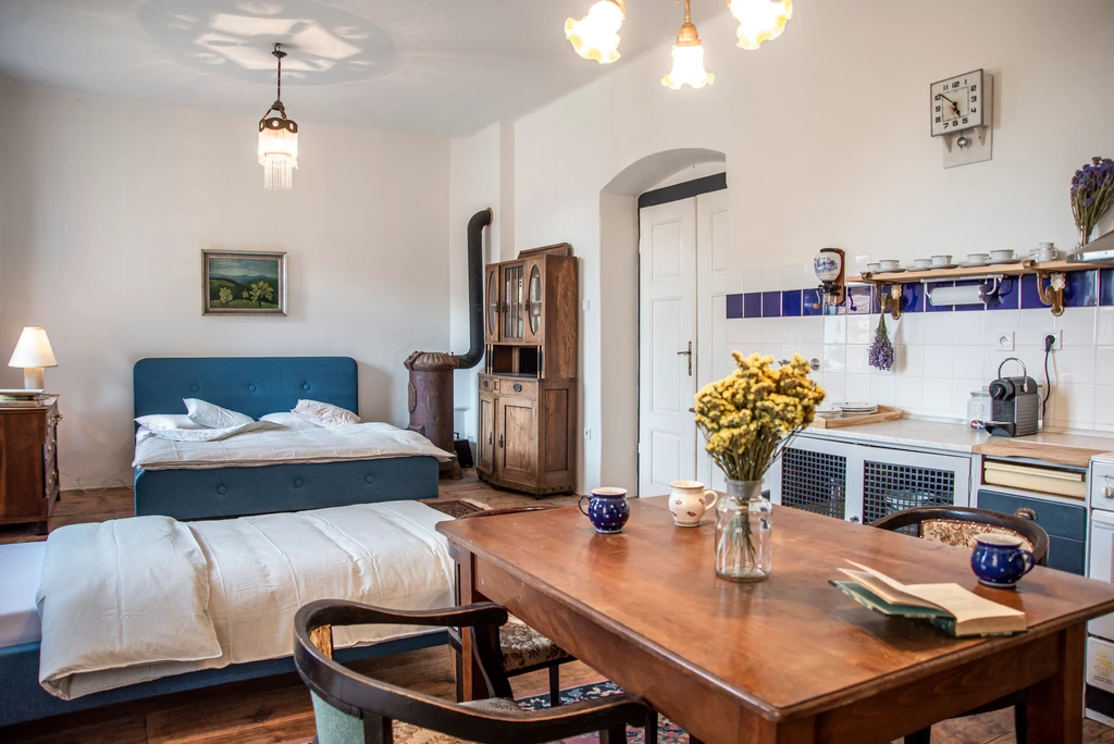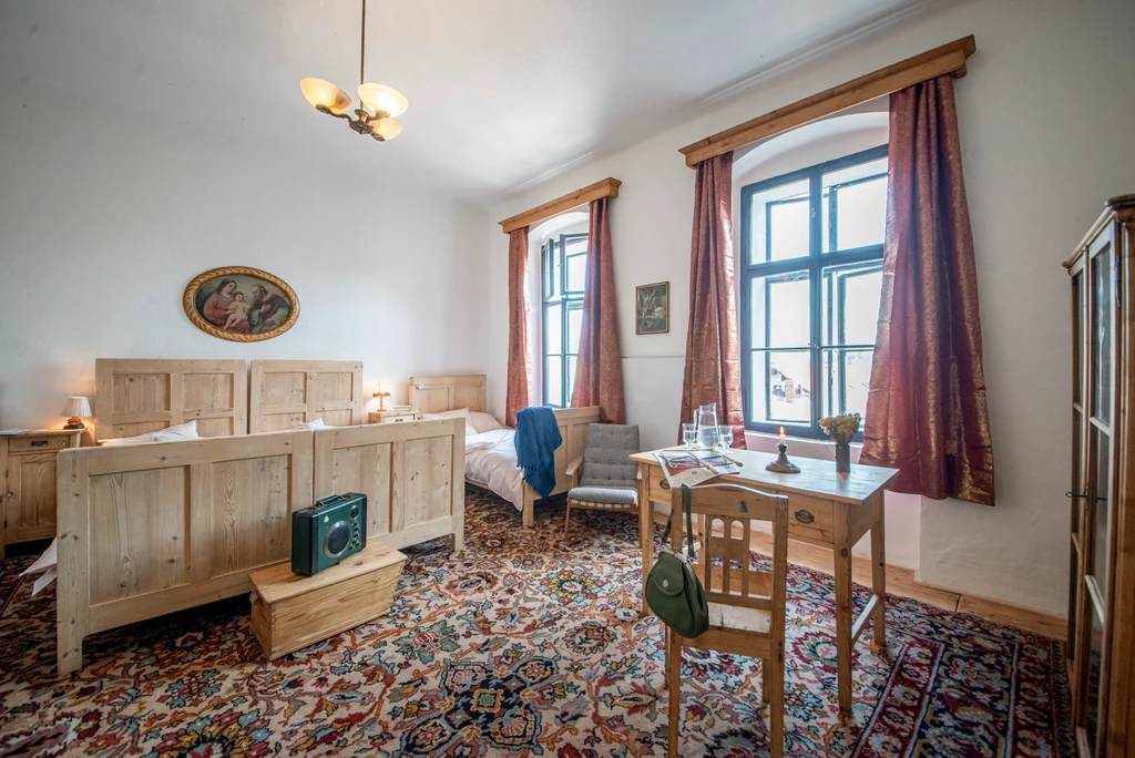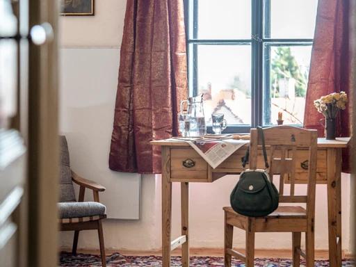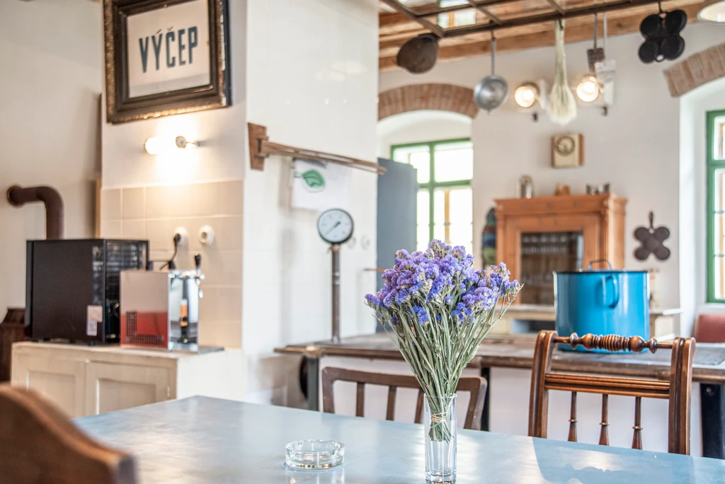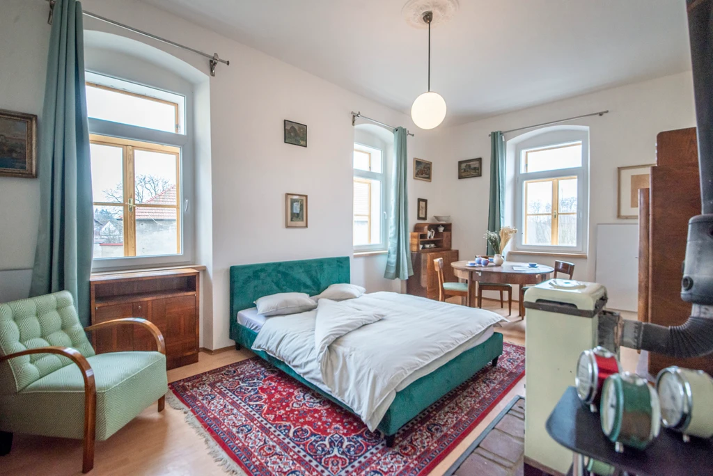 Bývalá vesnická škola se proměnila v místo, kde se učí hlavně odpočívat. Sborovna si zachovala šarm starých časů – vysoké stropy, krásné podlahy, prostorné pokoje z bývalých učeben – ale přidala komfort, díky kterému se sem vejde až 25 lidí a nikomu nic nechybí.