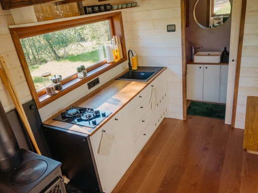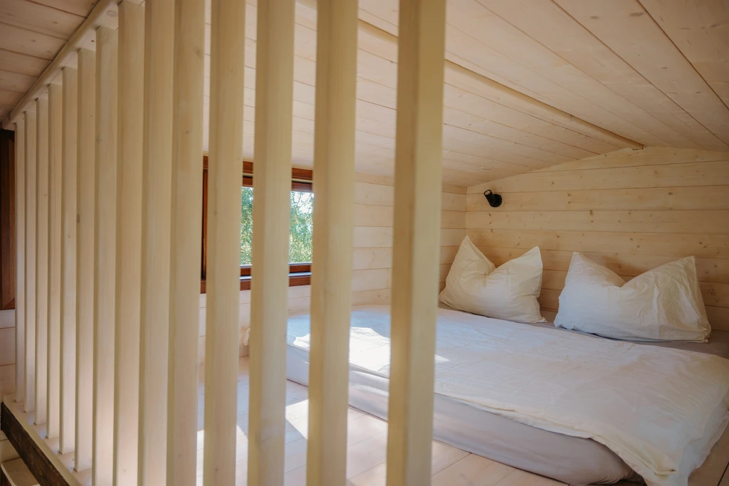 Šmírák stojí tam, kde začíná opravdové ticho, úplná divočina a klid. Jen vy, dřevo vonící po slunci, výhled do korun stromů a občasná návštěva zajíce nebo srny. Uvnitř vás čeká pohodlí pro čtyři dospělé – kamna na dřevo, plynové topení, útulná kuchyňka a postele, ze kterých se vám nebude chtít vstát.