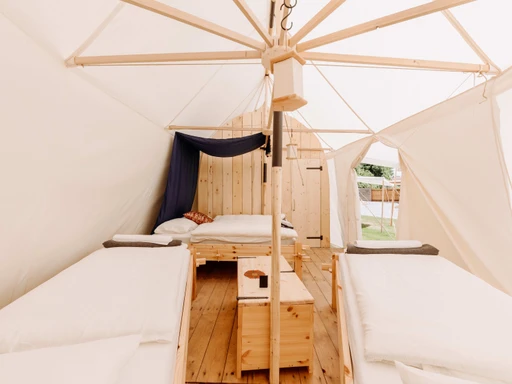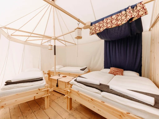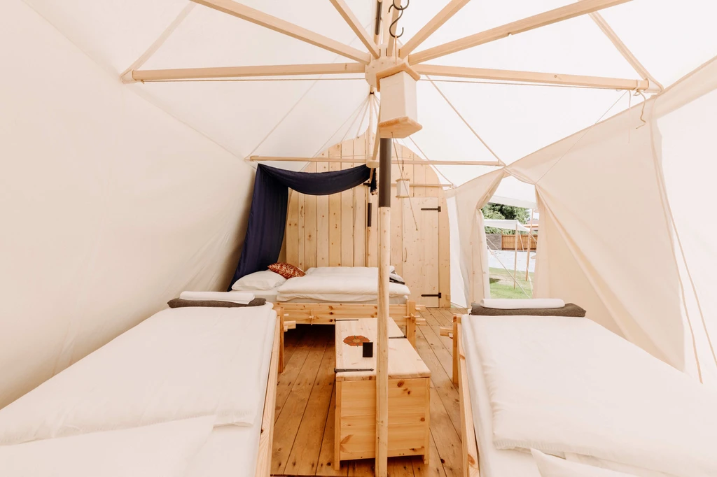 Stan Pohár je jedním z osmi prostorných stanů v kouzelném campu Malešov, který najdete jen kousek od Kutné Hory, pod dohledem středověké tvrze. Uvnitř na vás čeká manželská postel, dvě samostatná lůžka a vlastní koupelna se sprchou, toaletou i teplou vodou – komfort, jaký byste ve stanu rozhodně nečekali. Glamping v Malešově spojuje přírodu, styl i historii. Po dni stráveném u rybníka nebo na výletě si můžete zajít na pivo do Přátelského pivovaru nebo povečeřet v originální Krčmě na konci světa. A pokud budete mít štěstí, zažijete i středověkou hostinu se vším všudy.