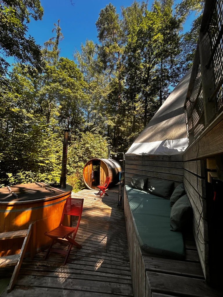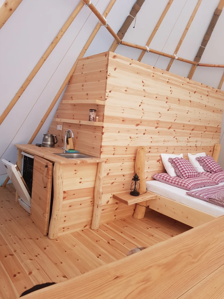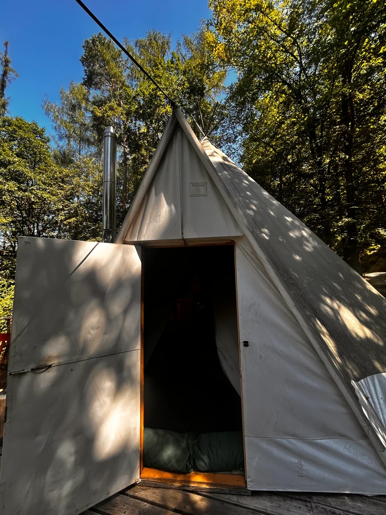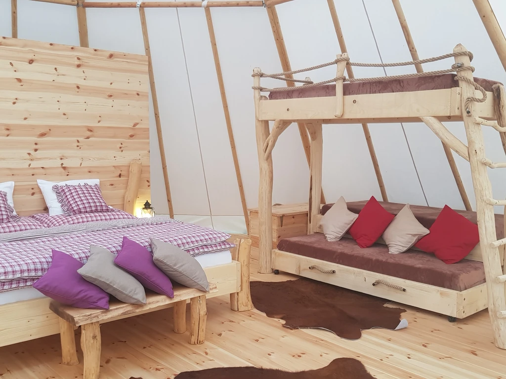 Ubytování v Teepee&Spa v Pyskočelích vás zavede do netradičního prostoru, který spojuje indiánský styl s pohodlím a moderním vybavením. Teepee je dost prostorné pro pět hostů a nabídne vše, co k odpočinku potřebujete – pohodlné postele, sprchu, toaletu, kuchyňku i prostor na deskové hry. V létě i zimě tu najdete klid i zážitek, ať už si ho dopřejete uprostřed lesa nebo na vyhlídkové terase. Vrcholem pobytu jsou venkovní lázně – koupací sud, sauna a venkovní sprcha, které přenesou relax na úplně jinou úroveň. Ideální místo pro ty, kdo chtějí vypadnout z každodenního shonu a na chvíli zpomalit.