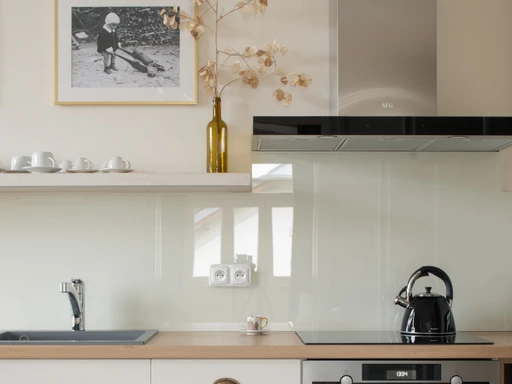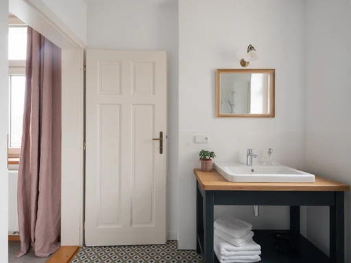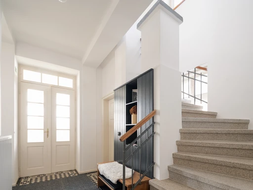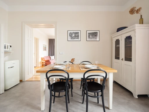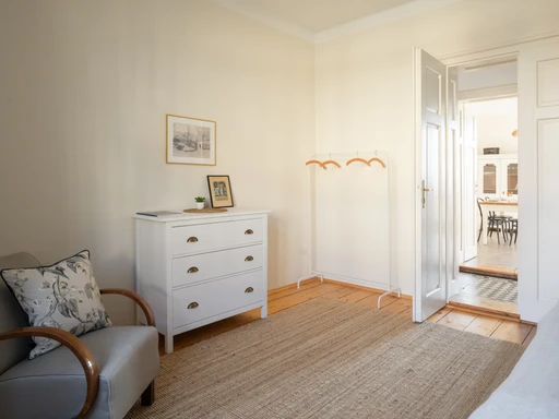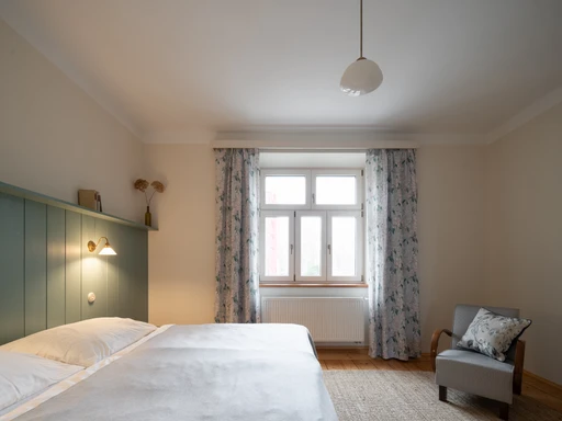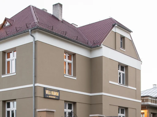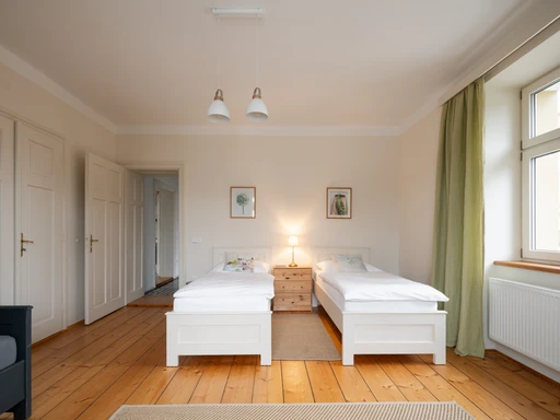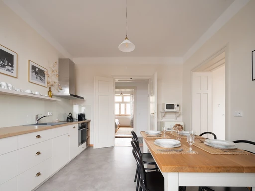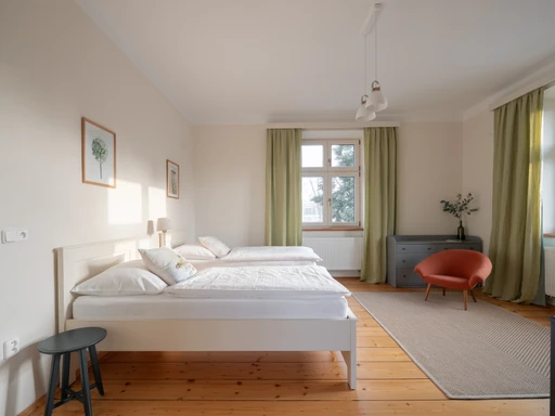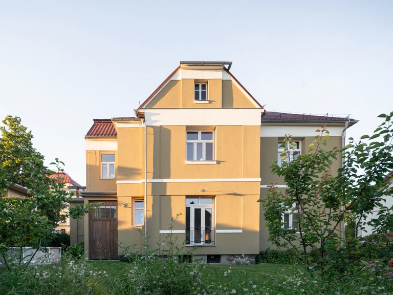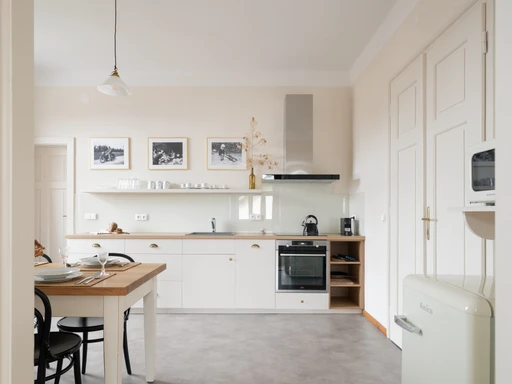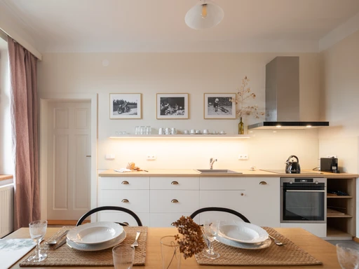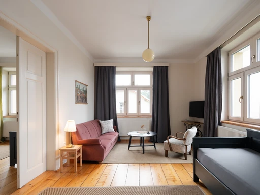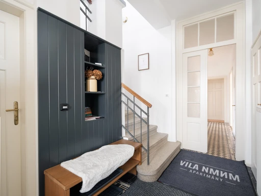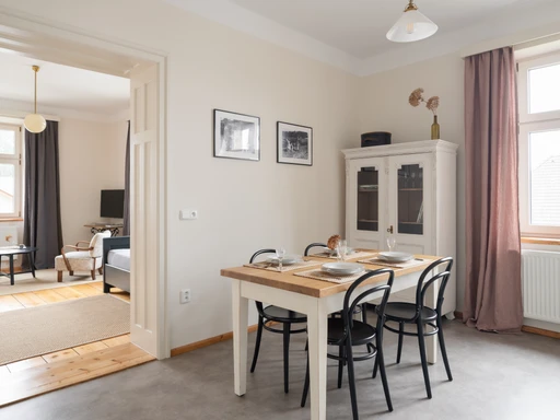 Citlivě obnovená vila z první republiky vás přivítá s noblesou – a bez zbytečné formálnosti. Dva prostorné apartmány plné světla, lněných závěsů a krásných detailů pojmou až 12 hostů. Každý apartmán má vlastní koupelnu, kuchyň s jídelním stolem, vše doladěno srdcem a s okem pro krásu – od čalouněných křesel po historické fotografie z půdy.