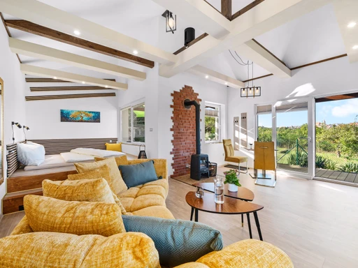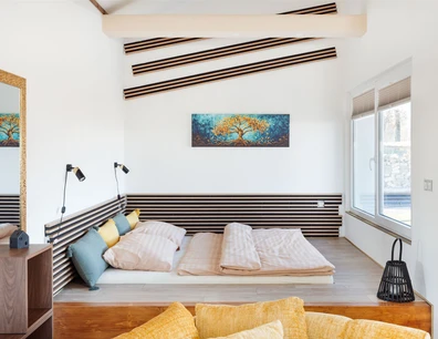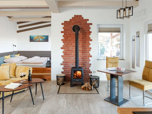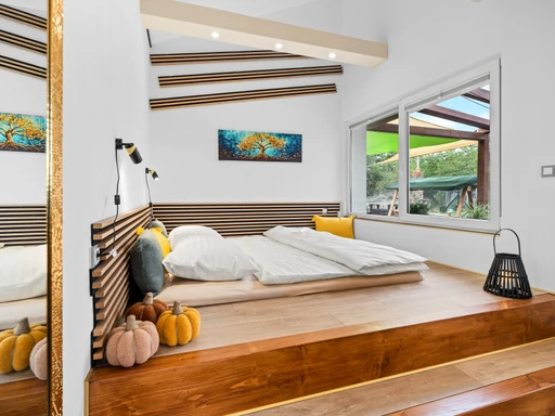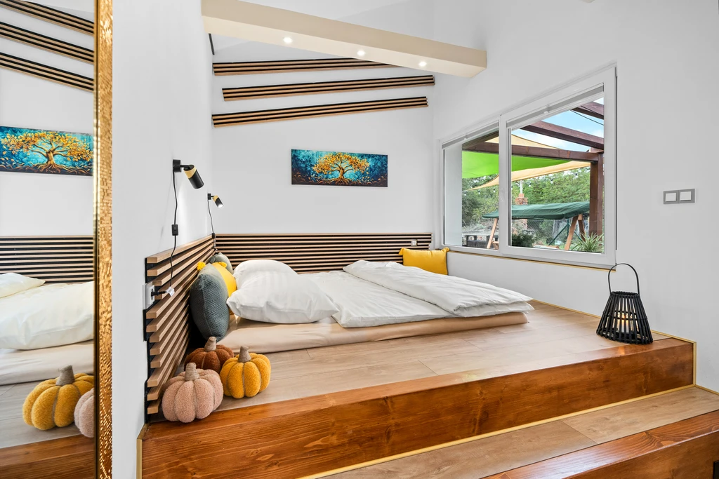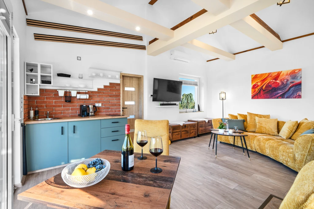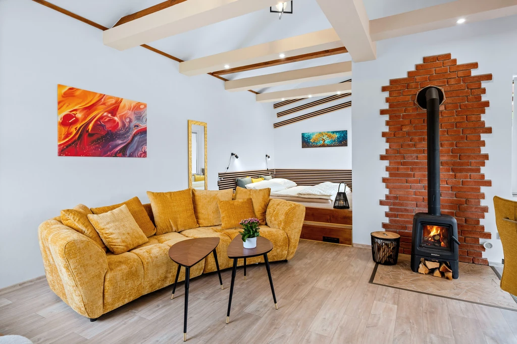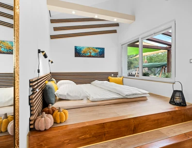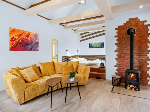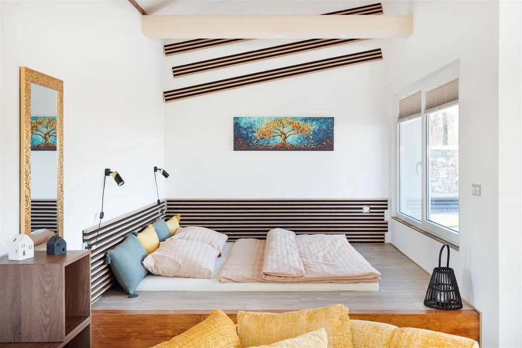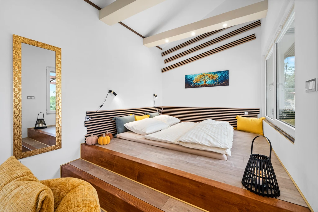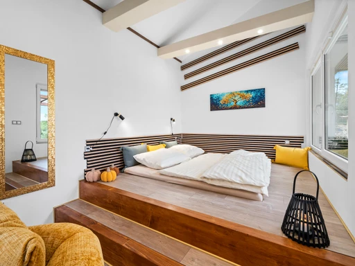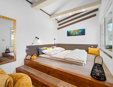 Ve Vilce na vás čeká prostorný obývací pokoj s kuchyní a velká, útulná postel na vyvýšeném pódiu, která přímo vybízí k odpočinku. Samozřejmostí je vlastní koupelna a WC.