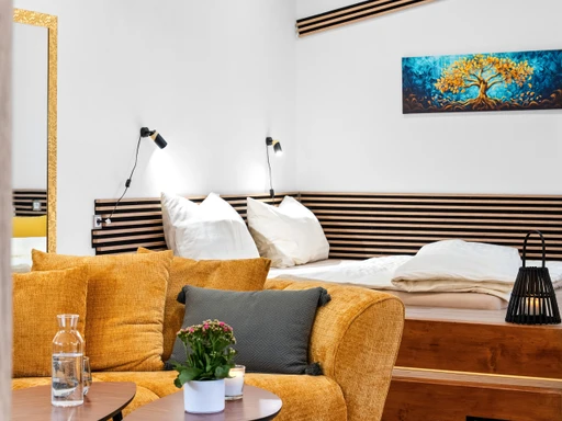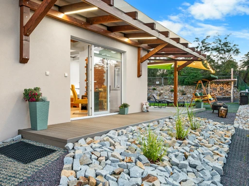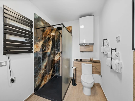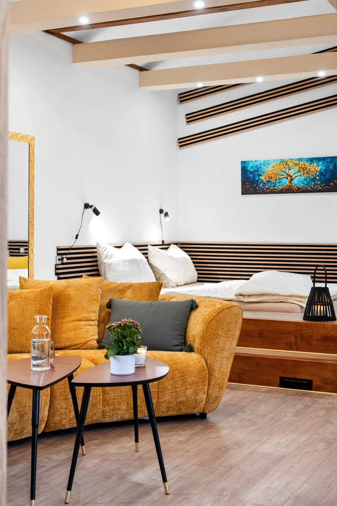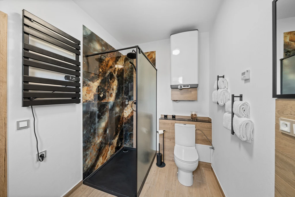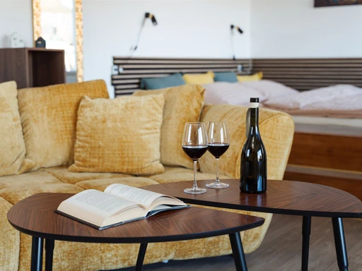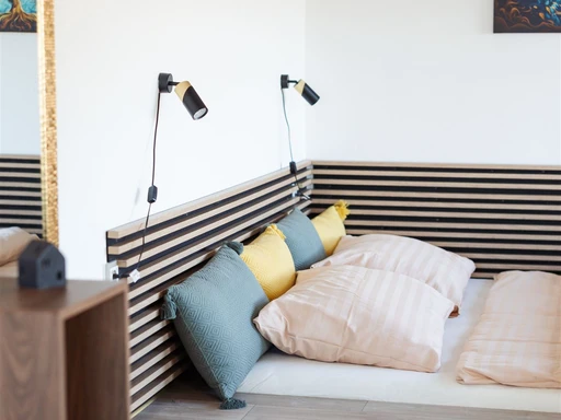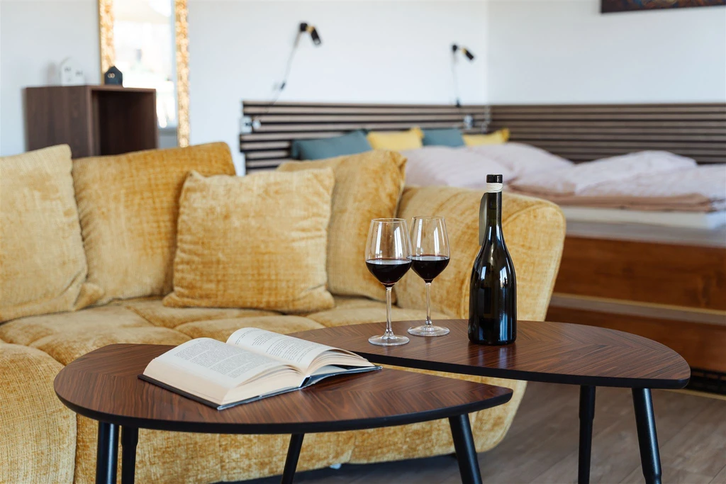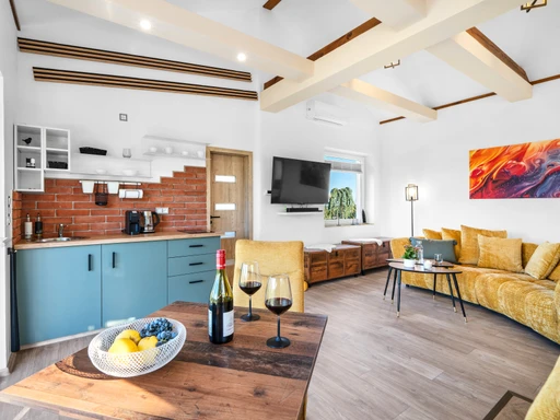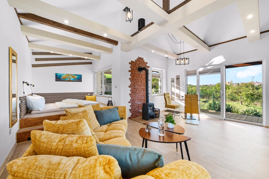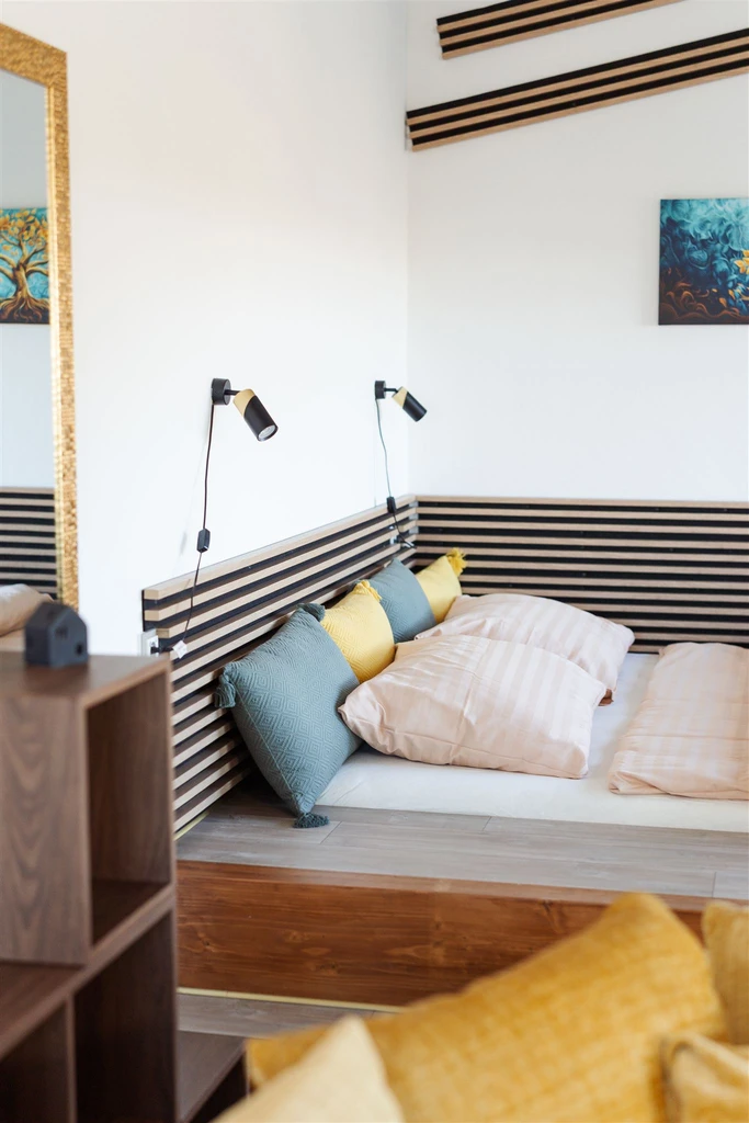 Ve Vilce na vás čeká prostorný obývací pokoj s kuchyní a velká, útulná postel na vyvýšeném pódiu, která přímo vybízí k odpočinku. Samozřejmostí je vlastní koupelna a WC.