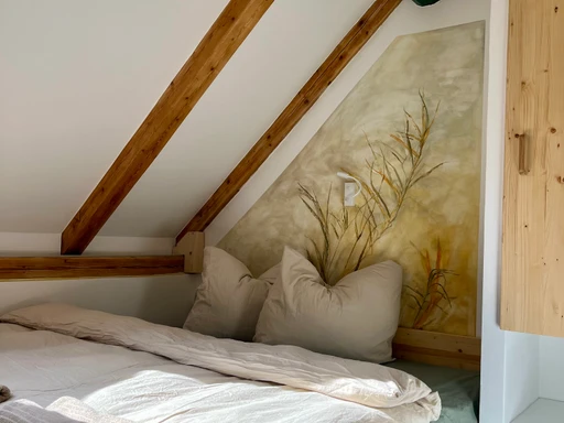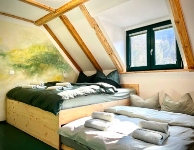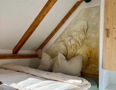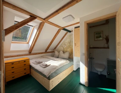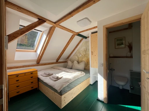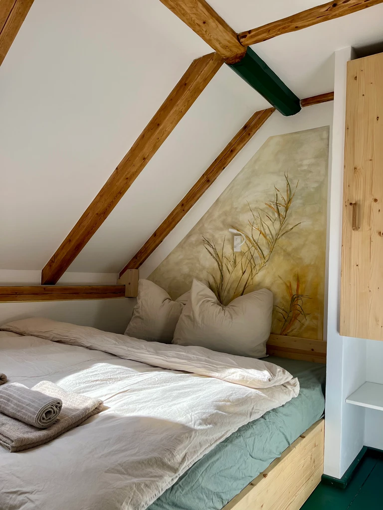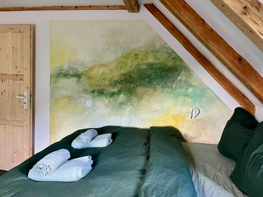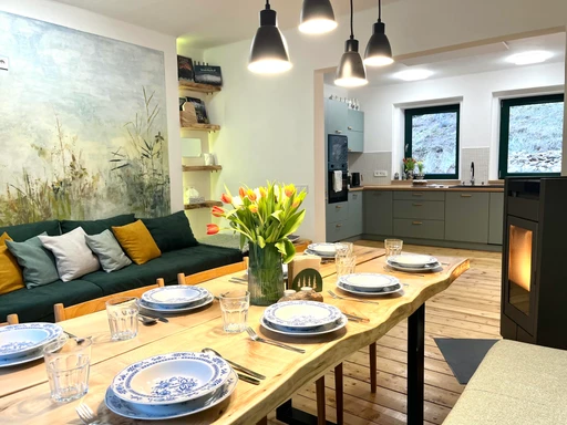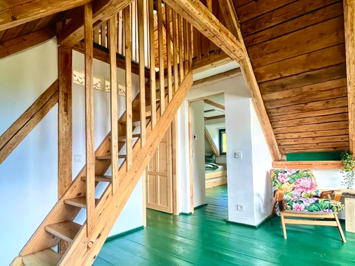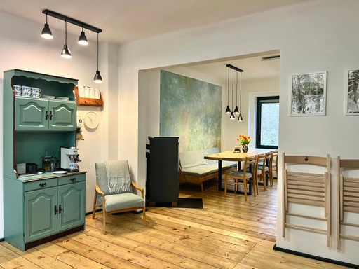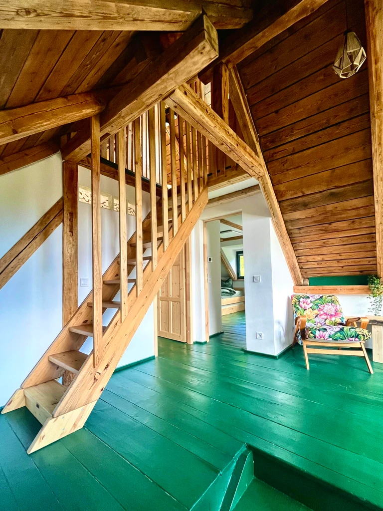 Tento zelený dům má jedinečnou atmosféru, která ho činí opravdu výjimečným. Interiér působí jako stylová boutique chalupa. Většina nábytku je původní, pečlivě zrestaurovaná, a doplňují ji kusy, které majitelé společně s jejich nejbližšími přáteli vyrobili vlastníma rukama – například postele, skříně či skříňky. Do kompletní rekonstrukce vložili spoustu času, energie i nadšení. Dům je ideálním místem pro rodiny s dětmi i skupiny přátel. Je to místo, které si prostě musíte osobně prožít.